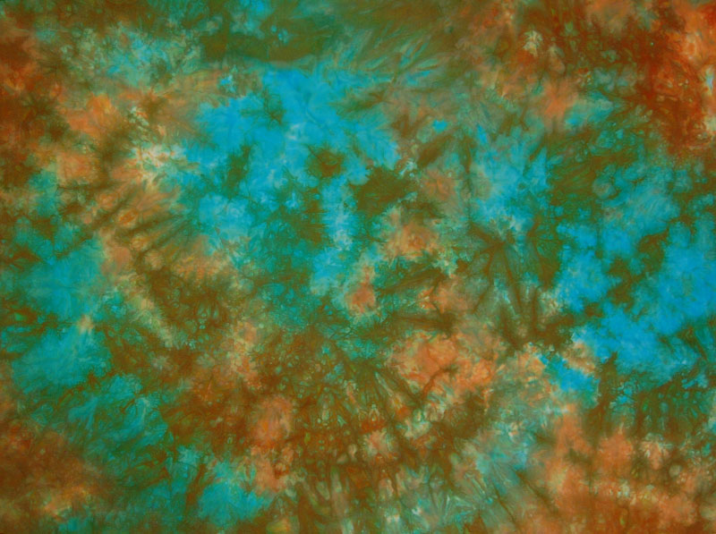 She asked for orange and turquoise with an all over pattern – and specifically wanted them to be vibrant. I pointed out to her that where the turquoise and orange meet there would be brown (because they’re opposites on the color wheel). She agreed, but I went ahead and just dyed a yard of fabric first to get an idea of how it would look: