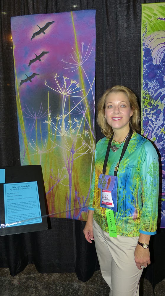 Here she is standing in one of her beautiful quilts and wearing a shirt made with fabric she designed and had digitally printed: