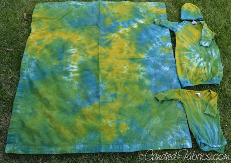 I made a large flannel receiving blanket, and dyed it along with a long sleeved onesie, cap and my favorite sleeper this delicious earthy green palette: