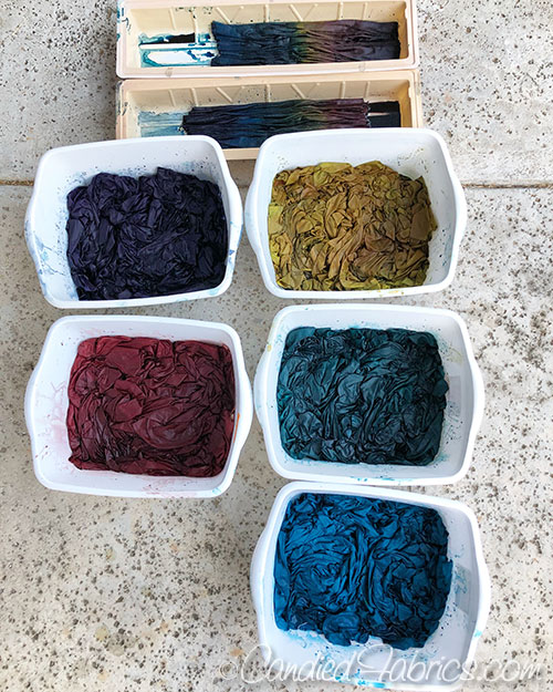 While cutting out the lining pieces from quilting weight fabric I noticed my stock of Autumn Splendor quilt weight was low, so I dyed 2 more yards of each color, along with 2 pieces of linen that are just the right height to become a flap: