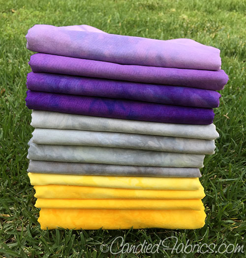 After choosing the hues of purple, grey and gold that my cousin and her hubby wanted for their new baby, I dyed up several yards of all three colors in different color intensities (aka tints).